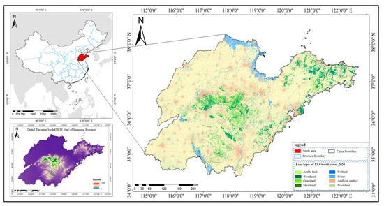 Overview of the study area. (The base map data is ESA/world_cover_2020, and the lower left corner displays the DEM of Shandong Province).