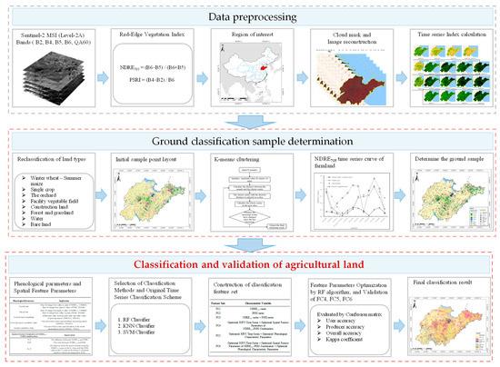 The classification methodology comprised three interconnected components. Initially, we optimized three machine learning algorithms (random forest, support vector machine, and K-nearest neighbor) using standardized accuracy metrics. We then developed two feature parameter sets: SFPs (spatial feature parameters) of NDRE705-PSRI Combination) for spatial characterization and PFPs (phenological feature parameters) for temporal characterization analysis. The final implementation combined the optimal algorithm with selected time series features and parameter sets to classify agricultural lands across Shandong Province. Validation using independent samples and confusion matrix analysis demonstrated robust classification performance while maintaining computational efficiency at regional scales.