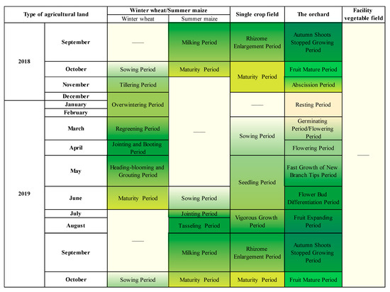 Phenological information of major agricultural lands in Shandong Province (crop calendar). (Summarization based on statistical information from the Department of Agriculture and Rural Affairs of Shandong Province [49]). The color changes represent the process of crop growth to decay.