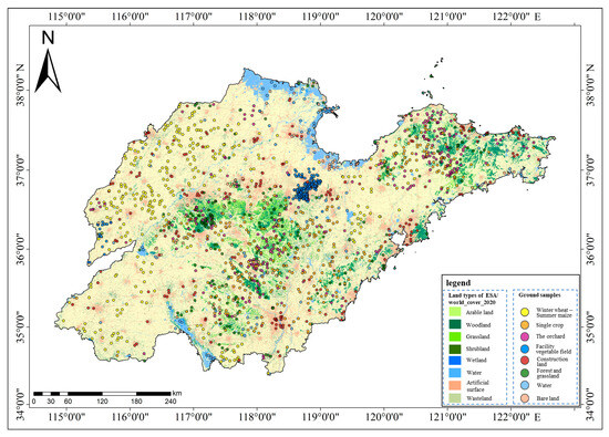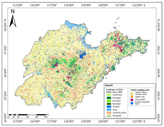 Initial sampling points were established utilizing the 2020 global 10 m ground cover data (obtained through the GEE platform) as the foundational map. Analysis of the base map data revealed that the three categories of agricultural land use in the study area (winter wheat–summer maize rotation area, single-season crop field, and orchard) were situated within the arable land category, whereas the facility vegetable field was situated within the wasteland category. Furthermore, overlay analysis of the 30 m digital elevation model (DEM) data (acquired through the GEE platform) and the global 10 m ground cover data in Shandong Province indicated that orchards were predominantly situated in areas with DEM > 100 m, single-season crop fields were located in areas with DEM > 50 m, and winter wheat–summer maize rotation areas and facility vegetable fields were mainly found in areas with DEM < 50 m. Based on the aforementioned analysis, coupled with data on the typical crop planting regions in Shandong Province, 1000 sampling points were strategically positioned. Specifically, 1000 sampling points were allocated from arable land with DEM < 50 m as the initial sampling points for the winter wheat–summer maize rotation area; another 1000 sampling points were designated from arable land with DEM > 50 m for the single-season crop field; an additional 1000 sampling points were deployed from arable land with DEM > 100 m for the orchard; and a further 1000 sampling points were placed from the wasteland with DEM < 50 m for the facility vegetable field, with a specific focus on Weifang and Liaocheng. To prevent overlap and ensure data integrity, the initial sampling points were set at a distance of 100 m apart (Figure 4).