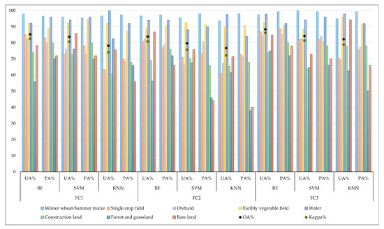 Figure 7 presents the evaluation of agricultural land classification accuracies using three original time series classification schemes: NDRE705 (FC1), PSRI (FC2), and NDRE705 + PSRI (FC3), assessed by three classification methods: RF, SVM, and KNN. The NDRE705 + PSRI time series demonstrates the highest classification accuracy, followed by the NDRE705 time series, with the PSRI time series showing the lowest accuracy. Among the three classification methods, RF outperforms SVM and KNN. Specifically, the classification set utilizing the RF algorithm and the NDRE705 + PSRI original time series achieves the highest accuracy, with an overall accuracy (OA) of 88.38% and a Kappa coefficient of 0.8621. For various agricultural land types, the recognition accuracy was highest for the winter wheat–summer maize rotation area. Consequently, the RF classifier exhibited the best performance in land use classification with extensive feature information. Moreover, the combination of NDRE705 and PSRI time series effectively enhanced the recognition accuracy of agricultural land types.