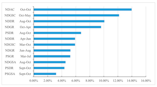 Five types of PFPs were calculated for each agricultural land type: growth rate, decay rate, growing season amplitude, growing season cumulative value, and annual cumulative value. In total, 32 PFPs were constructed (Table 4). Subsequently, the RF classifier was employed to classify the agricultural land using these 32 PFPs, and the classification accuracy was evaluated. The results indicated that OA of agricultural land classification based on PFPs was 85.63%, with a Kappa coefficient of 0.8297. This suggests that although it is feasible to utilize a collection of PFPs for agricultural land classification, its accuracy is lower than that of the NDRE705 + PSRI time series set. In this study, the 12 PFPs with the highest contribution rates (cumulative contribution rate of 86.82%) were selected to combine with the NDRE705 + PSRI time series for the identification of agricultural land types (Figure 9).
