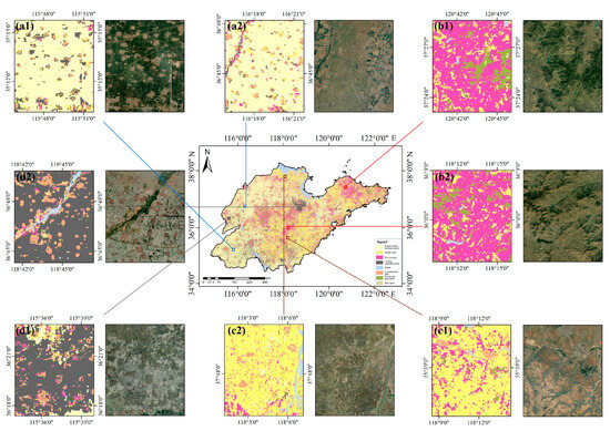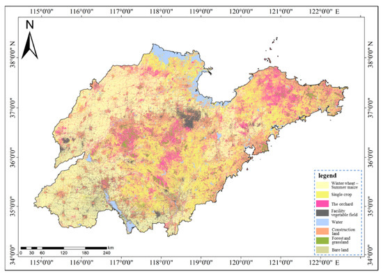 Presently, a high-resolution map depicting the spatial distribution of various types of agricultural land in Shandong Province is unavailable. Hence, the exploration of a rapid and precise method for acquiring data on agricultural land types and implementing the monitoring and mapping of regional agricultural land’s spatial distribution is of paramount importance for the effective management of agricultural land use and safeguarding agricultural production.