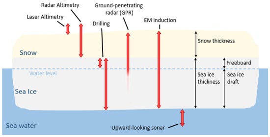 The World Meteorological Organization (WMO) defines sea-ice thickness (SIT) as an Essential Climate Variable []. For almost 50 years, the area and extent of sea ice in the polar regions have been continuously monitored from a series of satellite-mounted passive microwave sensors []. For climate change studies, it is advisable to consider both the area of coverage and SIT together in order to determine changes in sea-ice volume. However, it has been particularly difficult to monitor SIT directly from space. Satellite altimetry, such as that from CryoSat-2 [], can measure the height of sea ice above known sea level (known as freeboard, see Figure 1) and analytically determine SIT using several assumptions, such as hydrostatic equilibrium and snow depth as well as the density of the sea ice, snow, and ocean. Uncertainty in any of these assumptions can lead to erroneous SIT measurements, and additional modeling to account for snow layers is required []. There is, therefore, still a fundamental requirement for in situ measurement of SIT for calibration and validation of airborne and satellite data []. The traditional method for validation is to drill a hole through the sea ice via an auger and take a physical measurement using a T-anchor [,]. While this is a very accurate measurement, it suffers from the disadvantages of being time-consuming and destructive. Consequently, the approach offers poor spatial resolution, coverage, and repeatability.