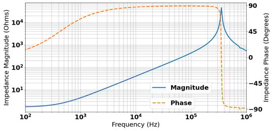 The impedance of the coil was measured using a Solartron 1260A impedance analyzer (Solartron Analytical, Farnborough, UK); this is shown in Figure 3. The figure shows that the coil has an inductive region between approximately 500 Hz and 200 kHz. Resonance of the coil occurs at approximately 350 kHz.