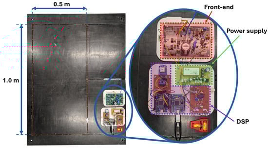 The detector system uses a single rectangular coil that measures 1 m × 0.5 m and consists of 15 turns of PVC insulated wire. The coil geometry is shown in Figure 2. The coil is embedded into a 0.9 m × 1.2 m panel of High-Molecular-Weight Polyethylene (HMWPE) and is held in place with epoxy resin. This reduces the chance of the coil deforming, which can add significant amounts of noise to measurements. This geometry and construction have been previously reported in [] and has previously been tested in polar trials as reported in [,].