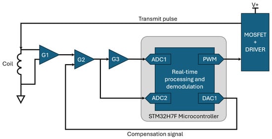 As shown in Figure 4, the EMI electronics consists of three major components—microcontroller-based DSP hardware, front-end electronics for interfacing the microcontroller with the coil, and low-noise power supply circuitry. The front-end electronics are a modified implementation of the system reported in []. The system is composed of a transmit stage, which consists of a MOSFET and associated electronics for driving high current pulses through the coil, and a receive stage, which implements four gain stages. These gain stages include an instrumentation amplifier (G1 ≈ 16.36), a summing amplifier (G2 ≈ 1.94), a subsequent gain stage (G3 ≈ −10.87), and a final gain stage required to buffer and offset the input signal to the microcontroller (G4 ≈ 0.103 gain with a +1.65 V offset). An upgraded MOSFET has been added to the previously reported electronics. This enables faster switching transitions and significantly improves thermal performance. Other alterations include the replacement of the digital signal processing electronics, which is now performed on an STM32H723VGT6 microcontroller (STMicroelectronics, Geneva, Switzerland) []. The architecture of the system is shown in Figure 5; this excludes any buffering and offsetting stages required for interfacing with the microcontroller.