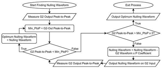 Under background conditions (i.e., in the absence of measurable targets), the response measured at the output of G3 (Figure 5) shows large regions of saturation. This is due to the decaying primary field, and the components of the oscillations within the coil that could not be removed by hardware; these are unwanted signals which do not provide any useful information about target responses. To overcome these unwanted signals, this system implements a dynamic compensation process that can remove the background signal, therefore preventing saturation. By doing so this allows the majority of the dynamic range of the receive electronics to be used to measure the now isolated secondary voltages received from targets, which in this case is the seawater. The system uses a closed-loop controller to measure the output of G2 (Figure 5) and subsequently generate and store an appropriate waveform to self-null any background signals. Figure 6 shows the process of generating a compensation waveform for continuous injection. The flowchart shows a simplification of the process of subtracting the G2 Waveform × P coefficient, though, in practice, this is undertaken in the frequency domain. This, therefore, requires a live FFT of the signal, with components subsequently phase shifted by 180°. Additional calibration is also performed to ensure phase cohesion, which incorporates the system response of the closed-loop container; the coefficients for this are pre-computed and stored locally.