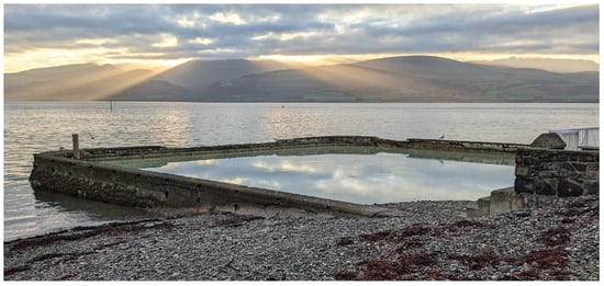 The field trials were conducted in the town of Beaumaris, Anglesey, UK. A man-made tidal pool that naturally fills at regular intervals was selected due to having a fixed depth and calm water conditions throughout the experiment. This would not be the case for the open sea, where tides, wind, and waves would cause varied depths and operating conditions and, therefore, increase experimental uncertainties. The pool is located at 53°15′55.5192″ N, 4°5′9.78″ W, and is shown in Figure 9. Samples of the seawater were taken from the pool and the adjacent ocean; these were measured with electrical conductivities of 57.3 mS/cm and 58.8 mS/cm, respectively. Therefore, the water within the pool is considered to be representative of seawater, which has a mean oceanic salinity of 52.6 ms/cm []. This value is slightly above the mean electrical conductivity of seawater in polar regions, as stated previously, as 24 to 27 mS/cmbe. Though there is a small difference in these values, it is sufficient to evaluate the performance of the detection system as they are of the same order of magnitude. This allows the ability to establish underlying correlation with simulation and to propose algorithmic approaches to quantifying absolute lift-off (distance between the sea surface and sensor system) values as a proxy for SIT. The conditions on the day of testing were clear, with an air temperature of 12 °C, and a wind speed of 9 km/h.