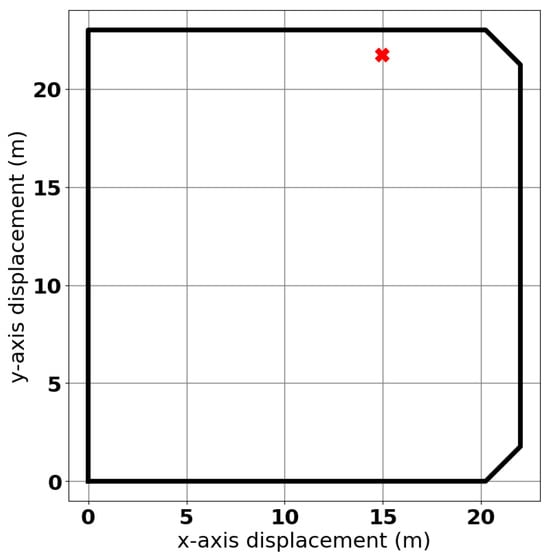 The dimensions of the pool were measured to be 22 m × 23 m. There was some minor variation in depth across the volume of the pool, but a test area was selected with a measured constant depth of 1.7 m. A survey of the pool was conducted to check for large ferritic clutter using magnets, and no such contamination was found. Small perturbations in sensor placement were made to ensure that no significant metallic contamination was present, and no such targets were found. A section of the pool 1 m from its northernmost retaining wall was therefore deemed to be a suitable testing environment. The approximate location within the pool is shown in Figure 10.