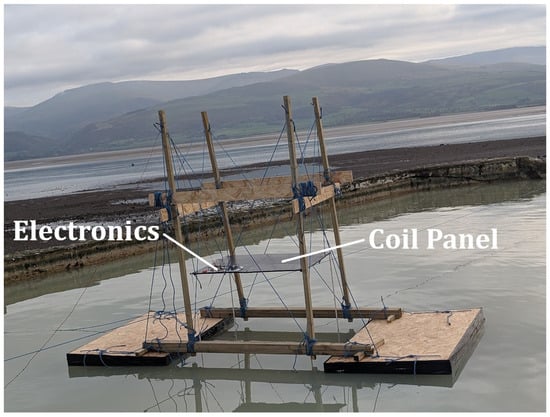 A bespoke, fully non-metallic test rig was designed and constructed to carry out tests over water. This consisted of floating the sensor array on two pontoons made from oriented strand board (OSB) wooden sheets and expanded polystyrene foam. This foam was sealed at the edges with water-resistant duct tape to mitigate water absorption by the foam. A spacing of 1.7 m was maintained between the pontoons, providing a sufficiently unimpeded view of the level water surface. A wooden structure was constructed on top of the pontoons, which allowed the panel containing the coil and sensor electronics to be raised and lowered from approximately 0.15 m to 2.1 m above the water level. Polypropylene rope was used for securing the various wooden structural elements, as well as to ensure the stability of the vertical posts. This arrangement allowed for the panel to be manually oriented in two axes. This was achieved by separately tensioning four ropes at each corner of the panel. This arrangement is shown in Figure 11. The rig and surrounding free space constitute a metal-free zone in which the seawater is the only conductive material.