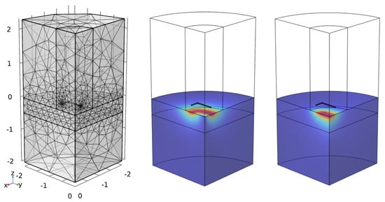 (Left) FEM Mesh for 3D Simulation, (Center) Current density norm for 0.2 m coil lift-off, (Right) Magnetic flux density norm for 0.2 m coil lift-off.
