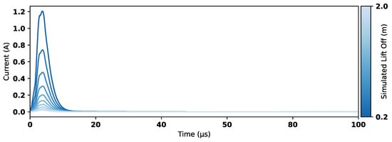 To keep the time steps sufficiently small within the period immediately following the current drop-off, the COMSOL implementation of a generalized alpha method [] was used with free adaptive time stepping and a maximum timestep of s. A parametric sweep was run for coil lift-off heights from 0.2 m to 2.0 m with 0.2 m increments. The simulation output consists of a set of induced eddy currents in the seawater as a function of sensor lift-off, as shown in Figure 13. These trends are compared with measured data in Section 5.
