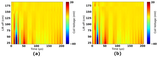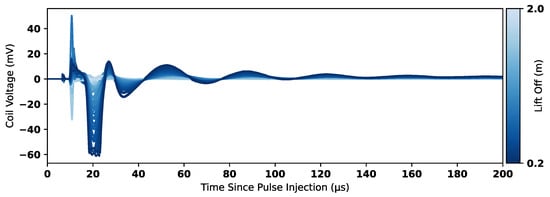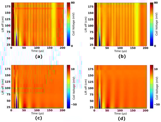 Figure 15 shows all experimental data collected in Experiments 1 to 4. The data have been scaled to account for gain stages and, therefore, correspond to the induced voltage in the coil. The reference 2.0 m time-domain response has been subtracted from all measurements to remove any resulting signal components that were not nulled in hardware by the injection of the compensation signal. Figure 16 shows the time-domain measurements separated by experiments; sub-figures (a) and (b) show the raw data for Experiments 1 and 2, respectively, and sub-figures (c) and (d) show the result of subtracting the 2.0 m reference. These figures show that the subtraction removes a significant amount of high-frequency information and DC offsets that are constant across all measurements. The resulting plots in Figure 16c,d, and in Figure 15 therefore focus on only the signal components that vary as a function of lift-off.