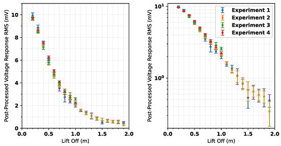 Post-processed measurement voltage RMS with lift-off (left) linear scale, (right) logarithmic scale. Error bars = ±2 standard deviations.