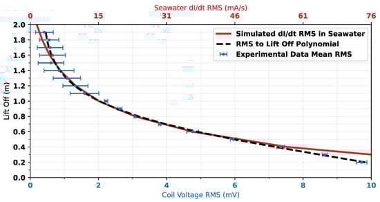As RMS voltage is being used for correlation with lift-off, to compare this with simulation data for , the RMS of has been calculated. Figure 19 shows the correlation between measurement data and simulated in the seawater. The mapping polynomial (Equation (3)) is also plotted for comparison. The figure shows that there is excellent agreement in the trends of measured RMS voltage and simulated RMS. The discrepancy between simulation and experimental data trends at lift-offs below 0.5 m is thought to be due to the saturation of the measurement waveform in this region. This saturation can be seen in Figure 15 at approximately μs.