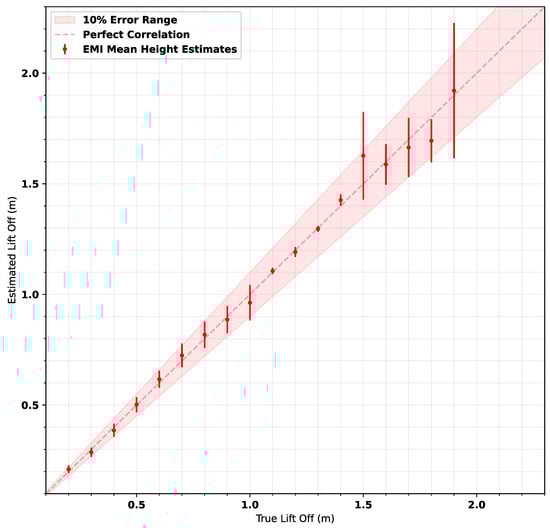 Figure 20 shows the mean estimated lift-offs against true lift-offs for all 8320 measurements collected throughout the trial. The graph shows that when excluding the two anomalous lift-offs at 1.5 m and 1.9 m, estimates are within 10% of the true value.