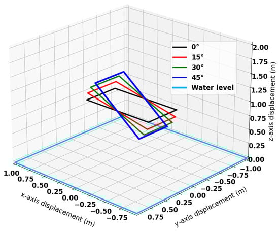 Several measures were implemented to characterize the position and orientation of the panel with respect to the water. The panel featured a weighted, submersible cloth measurement tape in each corner. The tape measures were all zeroed to the top surface of the panel, which had a thickness of 15 mm. This allowed each corner’s distance to the water to be set individually via appropriately tensioned rope, ensuring a uniform lift-off from the water.