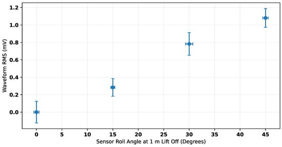 Response waveforms (as such in Figure 15) were referenced to the 0° waveform. The resultant waveforms could then be considered to be errors introduced by inclining the sensor. For comparison with the RMS trend used to estimate lift-off (Figure 18), the RMS of these waveforms is shown in Figure 22. The values in this plot can be considered representative of the additional expected error introduced in the RMS measurement of the response for each inclination tested. Table 2 shows the change in lift-off estimate introduced by inclination.