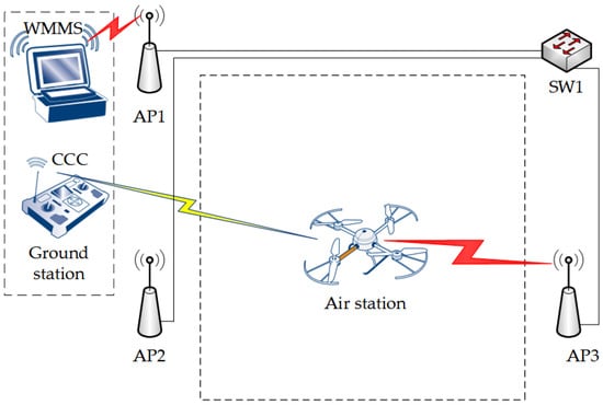 Unlike the air station, which was one device, the ground station was divided into two separate devices (Figure 1): the command and control console (CCC), and the WebRTC multimedia and monitoring station (WMMS). The CCC was used to pilot the IoT carrier. It was connected to the UAV via the control network (yellow lightning in Figure 1). The WMMS is designed for IoT purposes. It was connected to the monitoring software via the IEEE 802.11ac production network (red lightning in Figure 1), which was built as a heterogeneous extended service set (ESS). As an effect, the transmission between the air station and the WMMS was carried out both in a wireless environment and in a mixed wired/wireless one, in which the access points were connected to each other via a gigabit Ethernet (IEEE 802.3ab) network. The intermediate devices used in the ESS were NETGEAR Nighthawk X4 R7500 AC2350 access points (AP1, AP2, and AP3) and an HP 3500-24G-PoE+ yl Switch (SW1). The AP1 and the SW1 were placed close to the corners of a rectangular 70 m × 70 m parking lot, which was the test area. The AP2 and the AP3 were located at 50 m from the AP1 and the SW1, respectively.