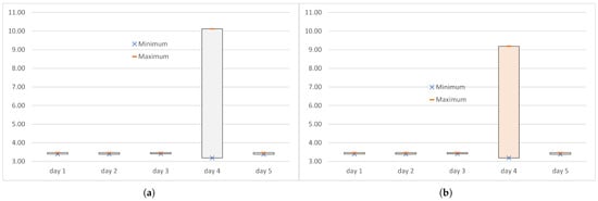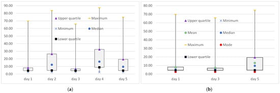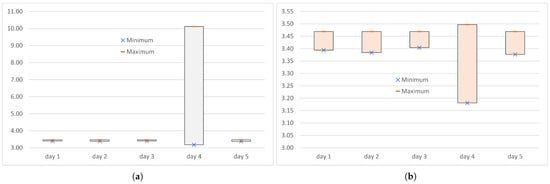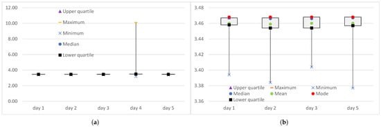 The occurrence of an error not only increased the maximum, but also lowered the minimum (Figure 2). For day 4, the minimum was 3181 µs, which is about 10% (300 µs) less than on the other days. Analysis of the instantaneous values (in some publications, e.g., Ref. [37], also called real-time values) of the end-to-end delay shows that the delay of the next burst after the packet loss decreased, then started to increase, and after a few seconds returned to the level observed before the transmission error. The truncated minimum, calculated after discarding the minimum and the maximum delay from the series of delays, was the same as the minimum (i.e., 3181 µs).