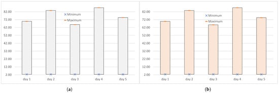 Table 3 includes the minimum and maximum of the end-to-end delays measured at the transport level when the IoT data were transmitted over the WebRTC data channel, and the truncated maximum , calculated after discarding the extreme values from the series of end-to-end delays . Day 4 was the only day on which the PER was not equal to zero, and the large maximum delay recorded on that day was the retransmitted packet delay.