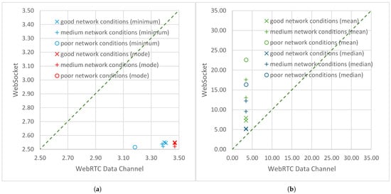 The rest of this paper is organized as follows: Section 2 analyzes related work. Section 3 discusses the materials and methods used during the experiments. Section 4 describes the field experiments, including post-selection of the measurement series for further analysis. Section 5 presents and discusses the measures of the location of the selected series of end-to-end delays, while Section 6 compares the transmissions carried out with the use of WebRTC and WebSocket in terms of the measures of location, as well as the measures of variation derived from these measures of location. Section 7 summarizes our experiences.