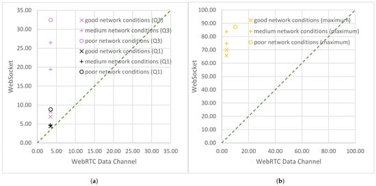 In the case of transmissions carried out over the WebRTC Data Channel, the times , and were measured for each transmitted IoT datum, where i was the sequence number of this datum. From these times, the delays and were then calculated according to Formulas (1) and (2), respectively. The difference between corresponding delays resulted from the processing of the payload of the SCTP packet (MQTT message) placed in the receive buffer of the logical channel. In the case of transmissions conducted over the WebSocket logical channel, performed for comparison purposes, for each transmitted IoT datum, the times and were measured, from which the delays were then determined, according to Formula (2).