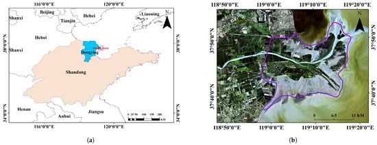 The Yellow River Delta, located in Dongying City, Shandong Province, is the largest newly formed delta along China’s coast []. It is home to the Yellow River Delta National Nature Reserve, established in 1992, with 55.1% natural vegetation coverage, making it the largest wetland vegetation area in coastal China []. The region experiences a temperate climate with distinct seasons and consists of simple plant communities, including P. australis, Cyperus spp., S. salsa, Spartina alterniflora, and T. chinensis. P. australis dominates freshwater and low-salinity areas, forming dense communities, while in highly saline soils, its growth is stunted. T. chinensis is prevalent in salt marshes and tolerates high salinity, often coexisting with S. salsa. S. salsa, a key salt-tolerant species, thrives in coastal mudflats and highly salinized regions, forming dense communities in moderate salinity, but its coverage declines in extreme conditions. These species reflect the delta’s dynamic, salinity-driven ecosystem.(Shandong Yellow River Delta National Nature Reserve Administration, http://hhsjzzrbhq.dongying.gov.cn, accessed on 2 September 2018). In this study, a portion of the Yellow River Delta was delineated as the research area (Figure 1).