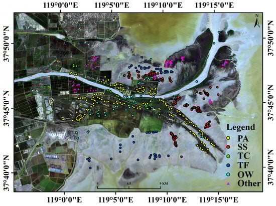 The sample data and validation data consist of three components. (1) Field surveys: In July 2020, a field survey was conducted in the study area. To ensure the purity of the samples, plots with a single vegetation coverage greater than 20 m × 20 m were selected. The survey results indicated the presence of three dominant species in the study area: S. salsa, P. australis, and T. chinensis. Most of the surveyed plots were located near roads and dikes. (2) Unmanned Aerial Vehicle (UAV) Survey: Simultaneously with the field investigation, UAV-based surveys were carried out. A DJI UAV was deployed to capture aerial images of representative vegetation areas in the Yellow River Delta. The surveys were conducted under clear weather conditions with moderate wind speeds, and flight altitudes were maintained between 100 m and 150 m. The UAV data were processed using software to generate orthophotos by synthesizing red, green, and blue (RGB) spectral bands. (3) Supplementation with Google Earth and High-Resolution Optical Imagery: Due to the presence of extensive marshes and mudflats in the Yellow River Delta, certain areas were inaccessible to both human investigators and UAVs. To address this limitation, high-spatial-resolution images from Google Earth and optical satellite imagery were used to supplement the dataset. UAV imagery and field samples were georeferenced onto Google Earth, and additional samples were interpreted based on the shape, texture, and color of specific vegetation types.