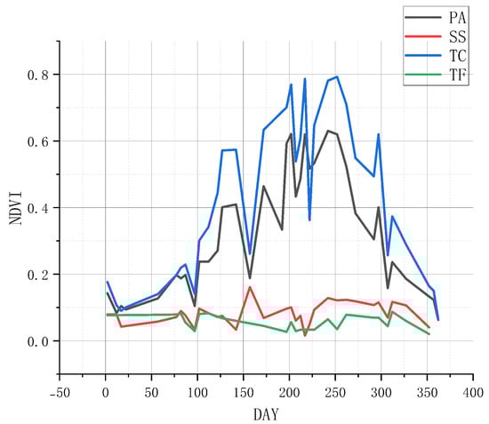 Mean time series variation of sample points. PA = P. australis, SS = S. salsa, TC = T. chinensis, TF = tidal flat.