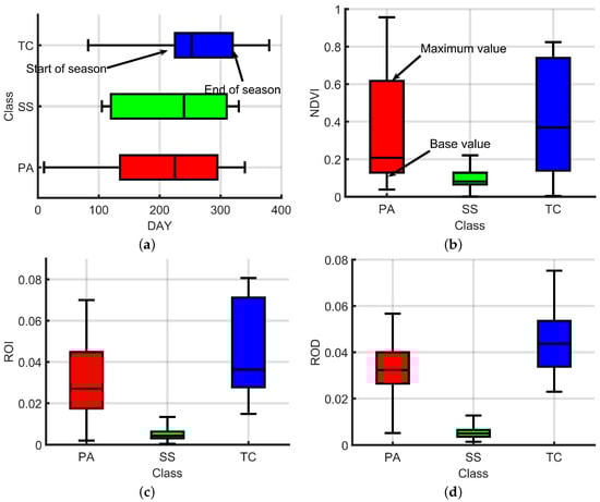 Box plot of phenological features for representative vegetation. Figure (a) shows the distribution of the seasonal start and end times for three typical vegetation types. The vertical axes of (b–d) are unitless, as NDVI, ROI, and ROD are all dimensionless. PA = P. australis, SS = S. salsa, TC = T. chinensis.