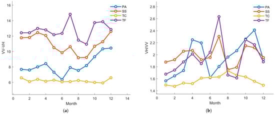 In terms of the polarization ratio (VV/VH), Figure 6b shows that the polarization ratio of P. australis remains consistently high and stable throughout the year. This indicates that its complex vegetation structure enables stable microwave signal scattering, maintaining a high level of reflectance even outside the growing season. The polarization ratio of T. chinensis increases significantly from June to August, displaying a pronounced peak, which aligns with its rapid growth in vegetation coverage and biomass during this period. This characteristic suggests that the stronger microwave scattering observed during the growing season is likely a result of its dense vegetation coverage and complex canopy structure. In contrast, the polarization ratio of S. salsa exhibits minimal fluctuations and remains at a generally low level throughout the year, reflecting its limited vegetation coverage and reduced microwave reflectance. Tidal flats show the lowest and least variable polarization ratio, indicating the absence of vegetation coverage and the lack of surface structural complexity, resulting in predominantly direct microwave reflection.