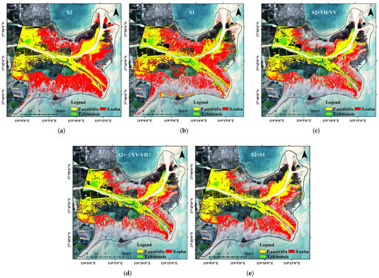 Figure 7 illustrates the classification results of typical salt marsh vegetation, employing five different approaches: based on optical phenological characteristics (Figure 7a), SAR polarization features (Figure 7b), the integration of optical data and SAR polarization ratios (VH/VV) (Figure 7c), the integration of optical data and SAR polarization differences (VV-VH) (Figure 7d), and the comprehensive integration of optical data with both SAR polarization ratios and differences (Figure 7e). The classification accuracy improves progressively with the integration of additional data features, as evident from the visual comparison in Figure 7. This trend is further supported by the classification accuracy statistics summarized in Table 5.
