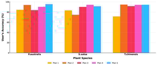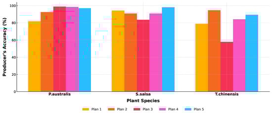 Plan 3 integrates Sentinel-2 data with SAR polarization ratios (VH/VV), improving classification performance. The inclusion of polarization ratios enhances the detection of structural differences, leading to more distinct boundaries for S. salsa and a partial reduction in overlap between T. chinensis and P. australis. Plan 4 incorporates SAR polarization differences (VV-VH) with Sentinel-2 data, further refining the spatial distribution of vegetation. Polarization differences effectively capture subtle variations in vegetation density and height, resulting in clearer separation between the three types.
