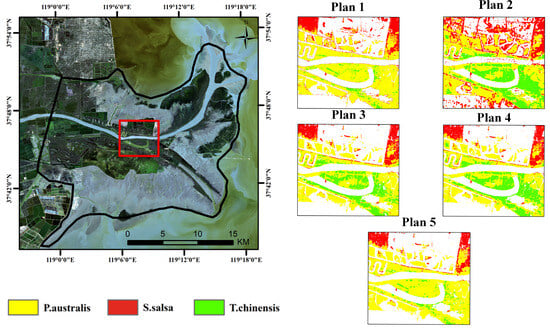 Figure 8 and Figure 9 illustrate the classification results of three salt marsh vegetation types (P. australis, S. salsa, and T. chinensis) based on five different classification approaches (Plan 1 to Plan 5) with the left panel showing the study area and the right panels highlighting a detailed comparison of methods. Each plan integrates different combinations of Sentinel-2 optical data and Sentinel-1 SAR features, revealing progressive improvements in classification accuracy and ecological relevance.