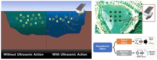 The increasing severity of environmental issues, such as global warming and the increased occurrence of algae blooms that degrade water quality, has become a pressing concern. Ultrasonic technology has emerged as a promising approach for controlling algae growth and improving aquatic environments, as in Figure 1 [1,2,3]. This study employs a Langevin-type piezoelectric transducer for underwater ultrasonic applications. In such applications, the piezoelectric transducer must operate underwater, where environmental factors, such as pressure and flow variations caused by water depth, induce mechanical loads. These loads alter the electromechanical impedance of the piezoelectric transducer. Furthermore, impedance mismatch occurs when the transducer operates with simple frequency control, reducing its power conversion efficiency [4,5].