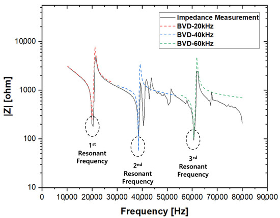 Comparison of measured impedance and impedance obtained from BVD modeling.