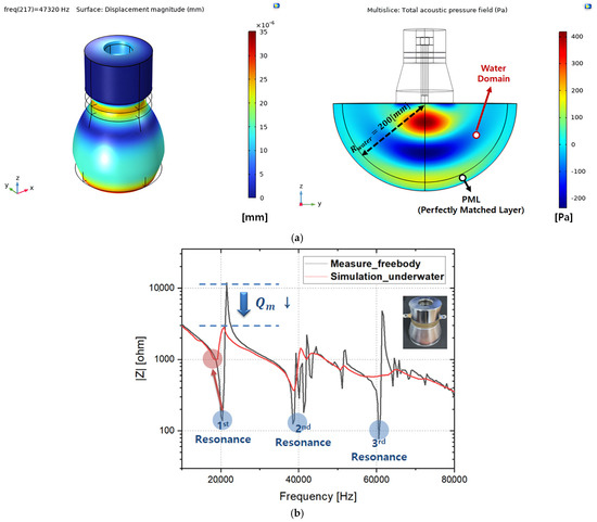 (a) FEM multiphysics analysis results in COMSOL and (b) impedance characteristics curve of COMSOL (underwater) and measurement (free body).
