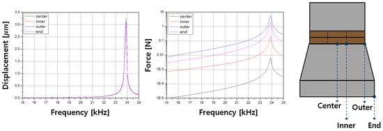 This study aimed to design an optimal model to minimize the reduction in the mechanical quality factor when employing ultrasonic transducers in underwater ultrasonic driving systems. The critical design considerations for the sealing and casing of the transducer module are the force and displacement. To evaluate performance, the displacement and force generated by the reverse piezoelectric effect in the free-body state of the piezoelectric transducer were used as benchmarks, as shown in Figure 6. The objective was to ensure that enclosing the transducer for underwater operation and safety does not degrade its vibration performance. The simulation models were evaluated based on four key points of the transducer: Center, Inner, Outer, and End [15,16].