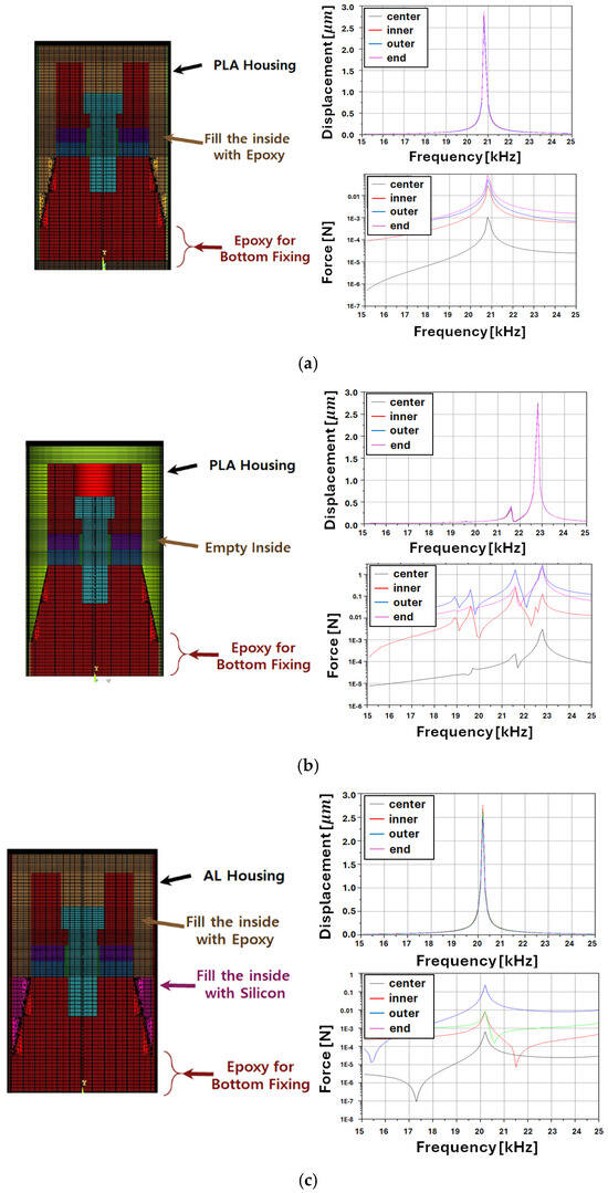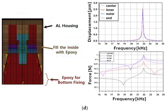 During the initial prototype design stage, the housing was intended to be fabricated using a 3D printer. The FEM analysis results for these cases are shown in Figure 7a,b. Aluminum was selected as the housing material to improve the vibration transmission and strain compared with PLA, as depicted in Figure 7c,d. Additionally, to ensure the waterproof stability of the transducer, the FEM analysis was conducted with the housing interior filled with epoxy or silicone. However, this structure introduced an additional mechanical load on the transducer, which increased the mechanical damping.