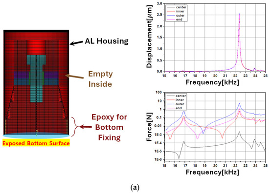Simulation results of displacement and force based on transducer module design under various conditions: (a) PLA housing, epoxy-filled; (b) PLA housing, empty; (c) AL housing, epoxy + silicon-filled; and (d) AL housing, epoxy-filled.