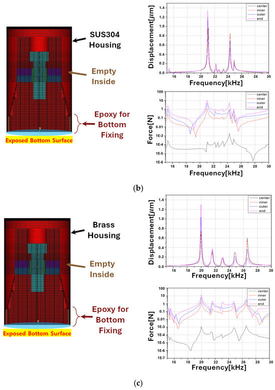 Additionally, based on the FEM analysis results of the transducer module design described earlier, Figure 8 presents the simulation results for the force and displacement corresponding to changes in the housing material (AL/SUS304/Brass). These results are derived from the conclusion that leaving the area around the piezo disk in a free state while partially fixing only the bottom of the module for the transducer’s fixation yields higher force and displacement.
