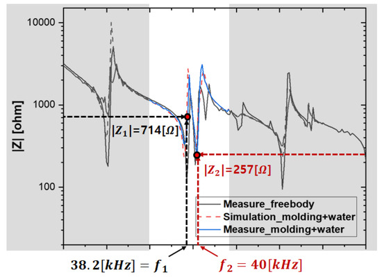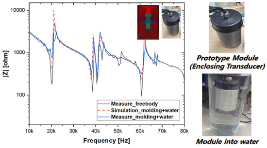 However, in this study, considering both results comprehensively, SUS304, which showed balanced and normal performance across all the regions, was selected as the housing material for the final prototype. Subsequently, as shown in Figure 9, a prototype module was developed, and the electrical characteristics of the ultrasonic application were verified by comparing the FEM simulation results with actual impedance measurements [6,8,15].