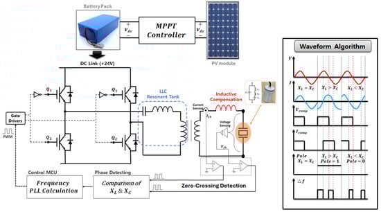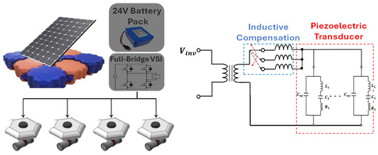 To implement the grid-type system described above, each module was designed as a small system. The primary DC link source comprised a 1 kWh PV panel and a 24 V battery pack. A full-bridge voltage source inverter supplied power to the transducer in four directions (Figure 10). In the algae removal system, the transducers operate at multiple resonances—20, 40, and 60 kHz—to enhance the efficiency of algae removal. This functionality is achieved using relays to adjust the inductive compensation, ensuring that the piezoelectric transducer receives the appropriate AC voltage and current at each resonance point.