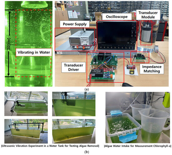 (a) Experimental, hardware configuration, and experiment result of transducer vibrating in water; (b) ultrasonic vibration experiment in water tank and algae water intake for measurement chlorophyll-a.