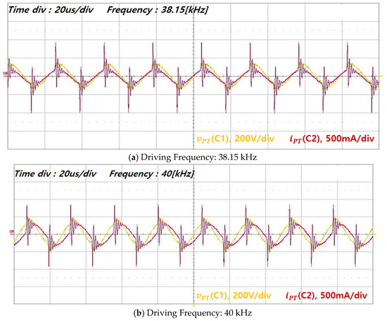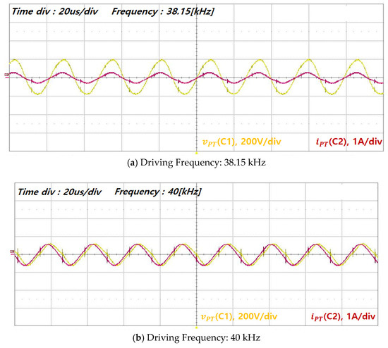 Additionally, to achieve maximum active power control, a PLL control system was configured using zero-crossing detection of the voltage and current of the piezoelectric transducer. The RLC parameters of the BVD-equivalent modeling used for circuit analysis and design are presented in Table 2 [17,18,19,20].