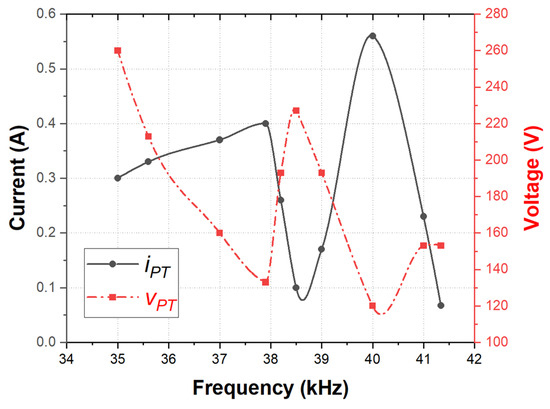 The experimental results for the transducer’s voltage () and current () near the second resonance point were consolidated into a graph as a function of the driving frequency. Piezoelectric transducers typically exhibit two resonance modes, resonance and anti-resonance, which are also referred to as series and parallel resonance modes, respectively. In the series resonance mode, the impedance is minimized, resulting in an increase in the current flowing into the piezoelectric transducer from the VSI. When an identical output power is applied to the transducer in both modes, the transducer operating in the series resonance state delivers a higher output force and a lower load speed. Conversely, the transducer operates at a higher speed with a relatively lower force in the parallel resonance mode. This behavior is based on the principle that the transducer’s output power is the product of the velocity and force transmitted to the emitting surface [4].