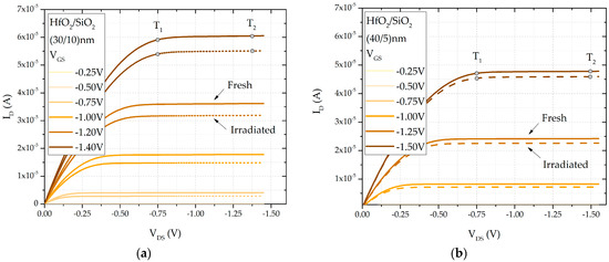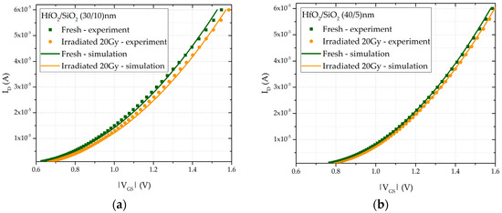 - McWhorter, P.J.; Winokur, P.S. Simple technique for separating the effects of interface traps and trapped-oxide charge in metal-oxide-semiconductor transistors. Appl. Phys. Lett. 1986, 48, 133–135. [Google Scholar] [CrossRef]