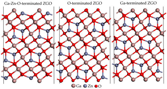 Schematic structures of Ga-Zn-O-terminated, O-terminated, and Ga-terminated ZnGa2O4(111) are considered in this study. Atoms are represented by spheres: Ga (brown, large), Zn (gray, medium-sized), and O (red, small).
